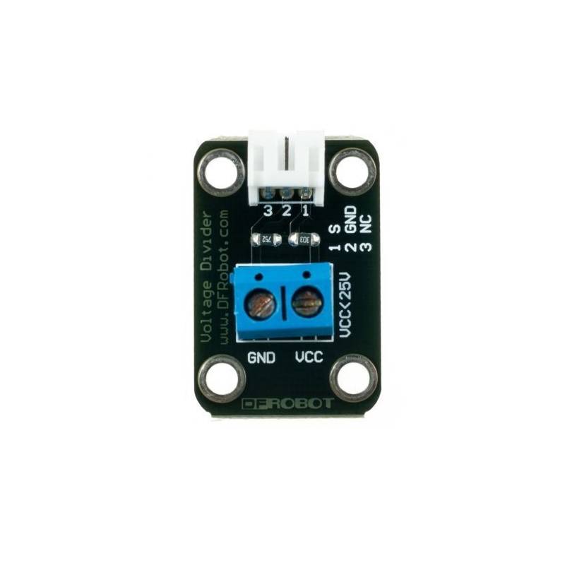 Ce diviseur de tension est capable de detecter une tension jusqu'à 25V. Il est basé sur le principe du pont diviseur de tension. Le module divise la tension d'entrée par 5. Comme la tension d'entrée d'un Arduino est de 5V, la tension à appliqué à l'entrée du module de détection ne devra pas dépasser 5Vx5 = 25V.