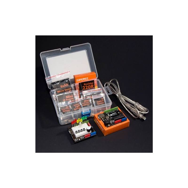 Ce kit éléctronique pour débutant est conçu pour les "Newbies" en électronique et/ou en Arduino. Ce kit vous permet d'appréhender le monde de l'Arduino et de la carte à base de microcontroleur en général et de démarrer la Robotique. Du contrôle d'une simple LED jusqu'à la maîtrise avancé d'une télécommande infrarouge, vous allez pouvoir passer de bons moments grâce à ce kit électronique et Robotique particulièrement complet.